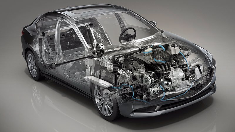 O motor e-Skyactiv G da Mazda, atualmente disponível com uma cilindrada de 2,5 litros para os modelos Mazda CX-30 e Mazda3*, apresenta uma relação de compressão de 13,0:1, injeção direta, desativação de cilindros e é combinado com o sistema Mazda M Hybrid para assistência elétrica**.